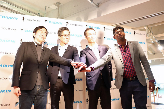 (左から)フェアリーデバイセズ 執行役員 江副滋氏、フェアリーデバイセズ 代表取締役 藤野真人氏、ダイキン工業 テクノロジーイノベーションセンター長 米田裕二氏ダイキン工業 テクノロジーイノベーションセンター 情報通信グループ Busi Ashish(ブシィ・アシシュ) 氏 |